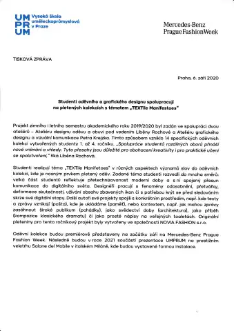 TEXTile Manifestoes, angažovaný projekt studentů a studentek UMPRUM představuje společnou práci studentů Ateliéru designu oděvu a obuvi s Ateliérem grafického designu a vizuální komunikace, Ateliérem tvorby písma a typografie a Ateliérem fotografie II.
